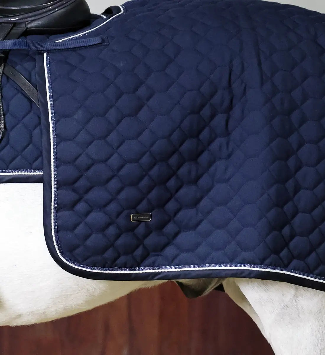 Elegant og funktionelt lændedækken i navy med ny quilting og for første gang præsenterer vi de eksklusive twist lamé cords i navy og hvid med en unik sølvmetallic kerne, der giver et sofistikeret og luksuriøst touch til det tidløse navy-design. Ridedækkenet er designet til at holde din hest varm og tør på kølige dage. Med 150g Synthermax-foring og en blød High IQ Cool Comfort-inderside sikres optimal komfort og effektiv svedtransport under ridning.