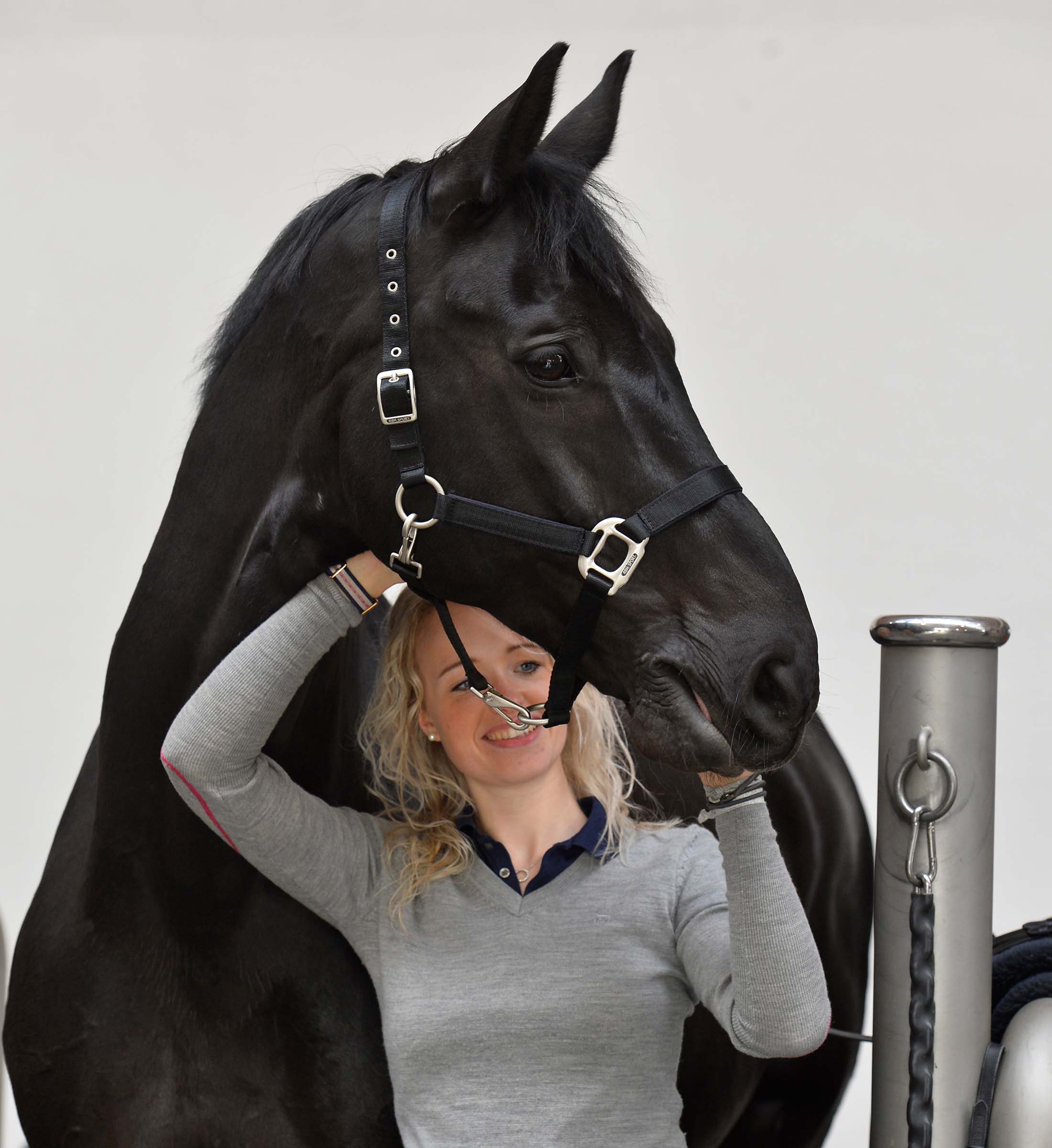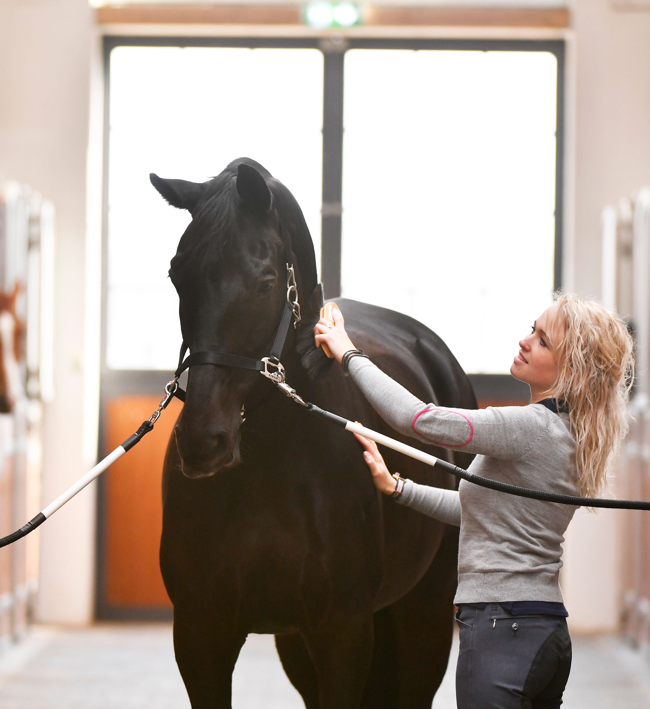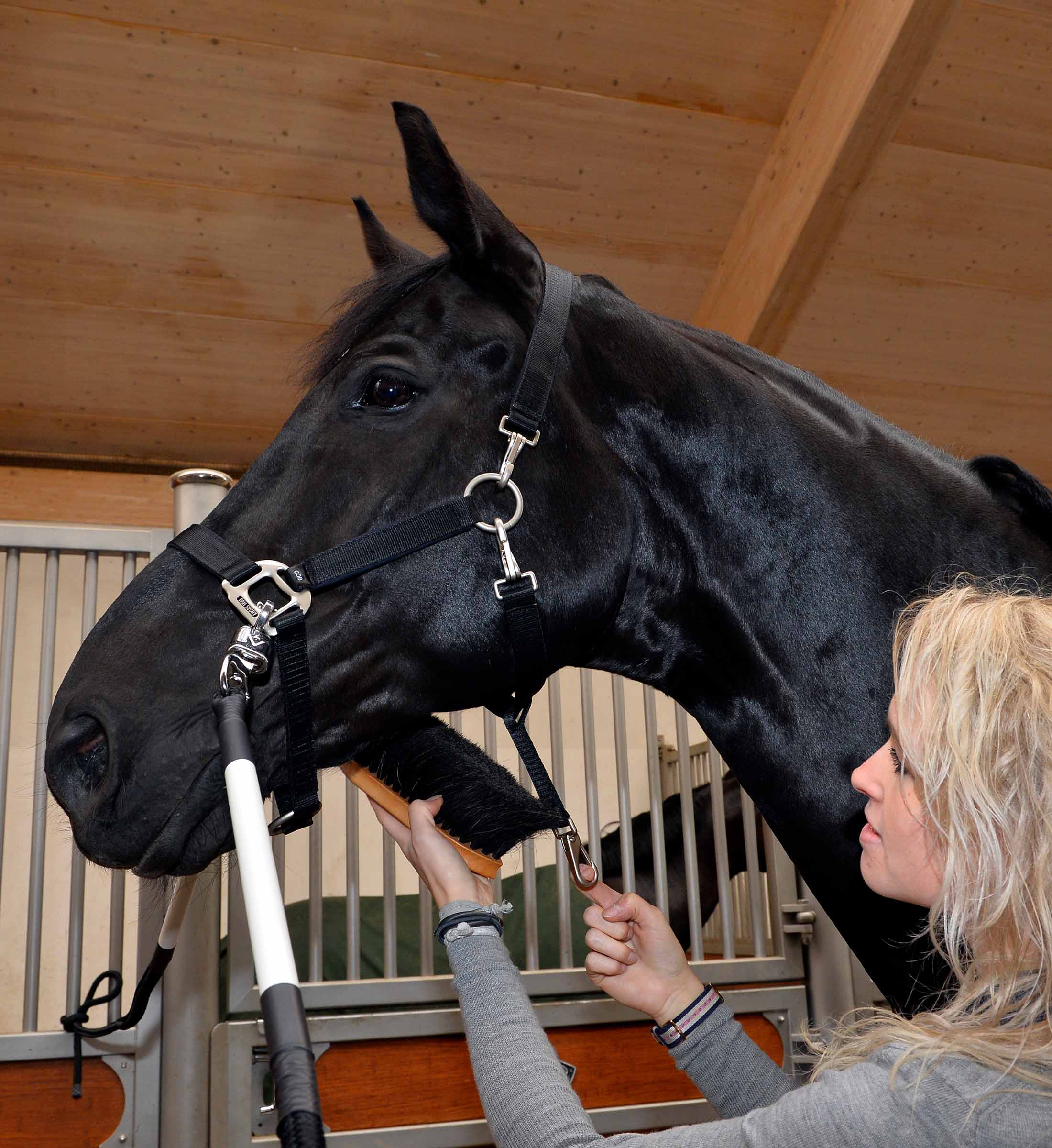 Kæbestykket på grimen kan spændes af helt eller delvis, således at det bliver nemt at børste eller klippe hesten på undersiden af hovedet.