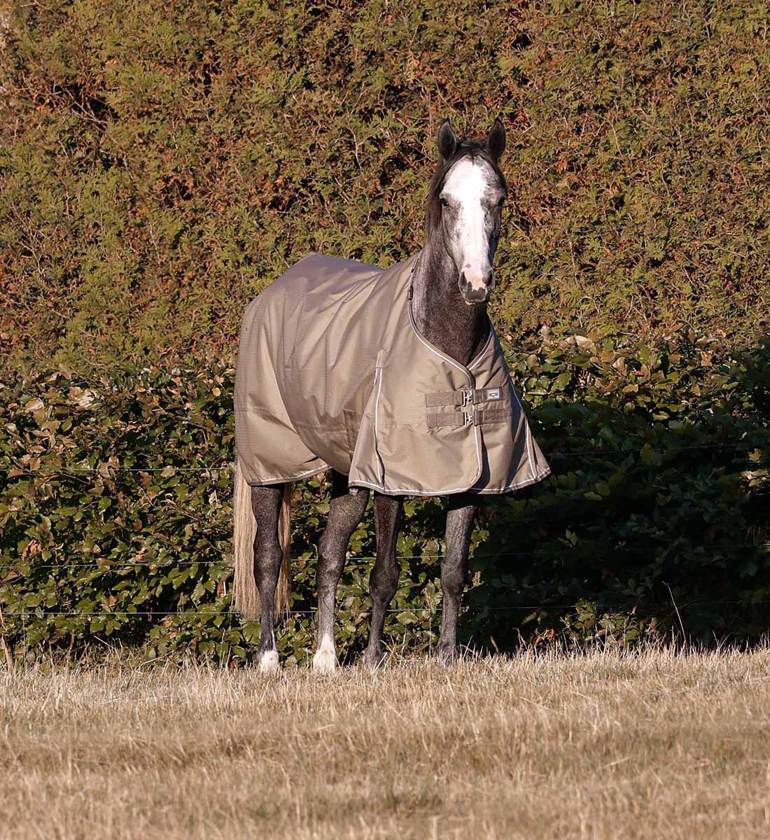 Medium varmt udedækken med 200g thermobonded fiberfyld. Yderside af høj kvalitets 600D ripstop. Inderside med glat stof hjælper til, at dækkenet lettere glider på plads, når hesten har rullet sig på marken.