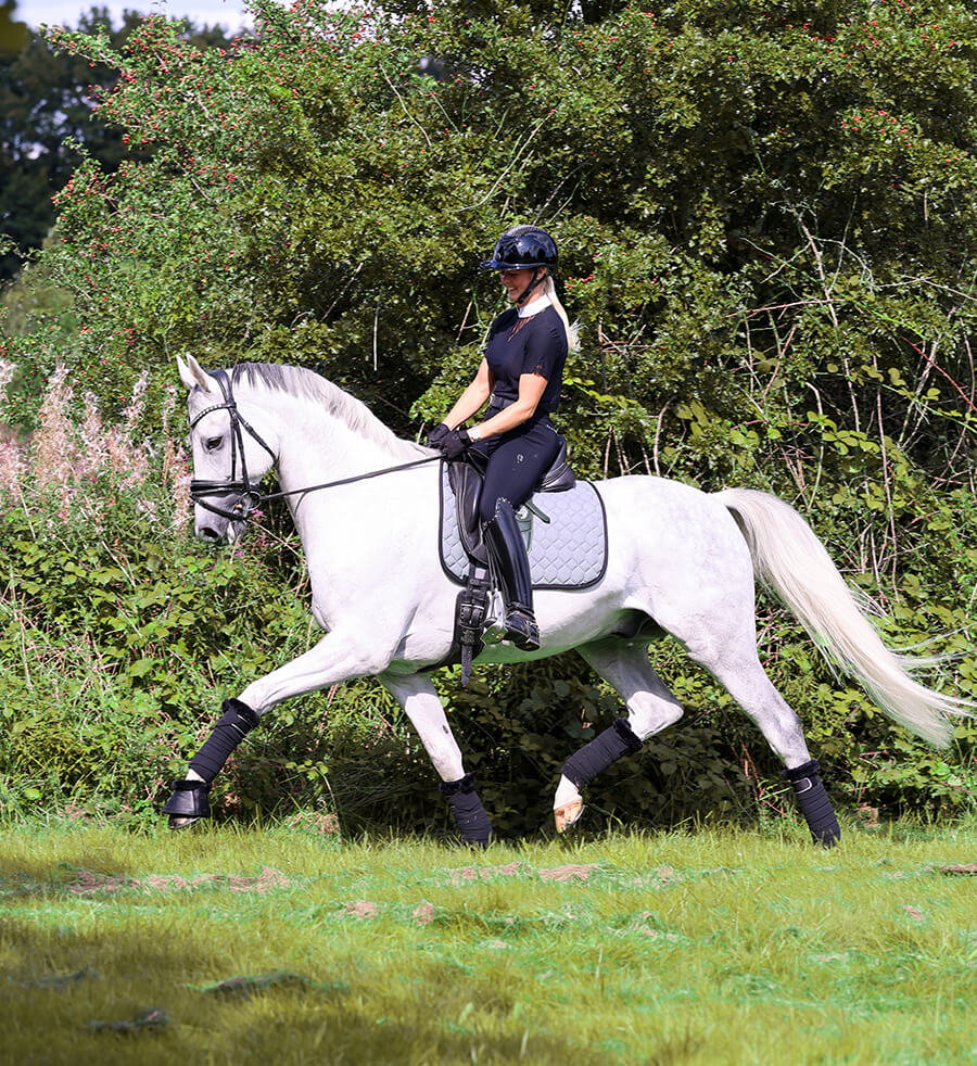 Dette Prestige Grey er i flot melereret two-tone grå med sort kantbånd. Sadelunderlaget er fremstillet af førsteklasses materiale, der sikrer holdbar farve og form, selv efter gentagne vaske. Det er både åndbart og hurtigttørrende.