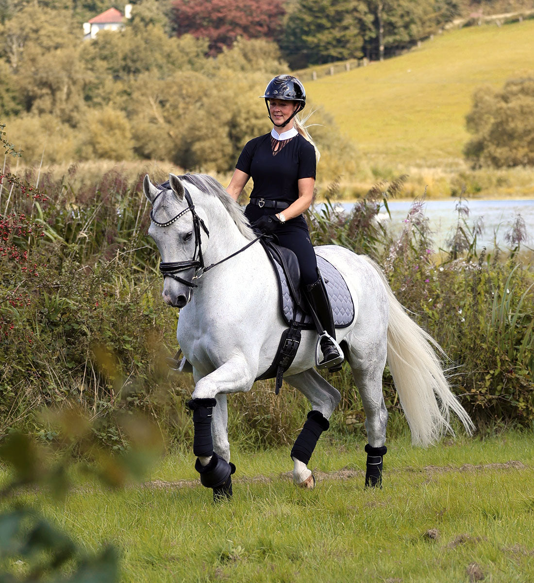 I dressurmodellen med korte sadelstropper der fæstes i sadlens D-ring, så underlaget ligger korrekt. I springmodellen med lange sadelstropper, så D-ring frit kan bruges til fortøj eller martingal.