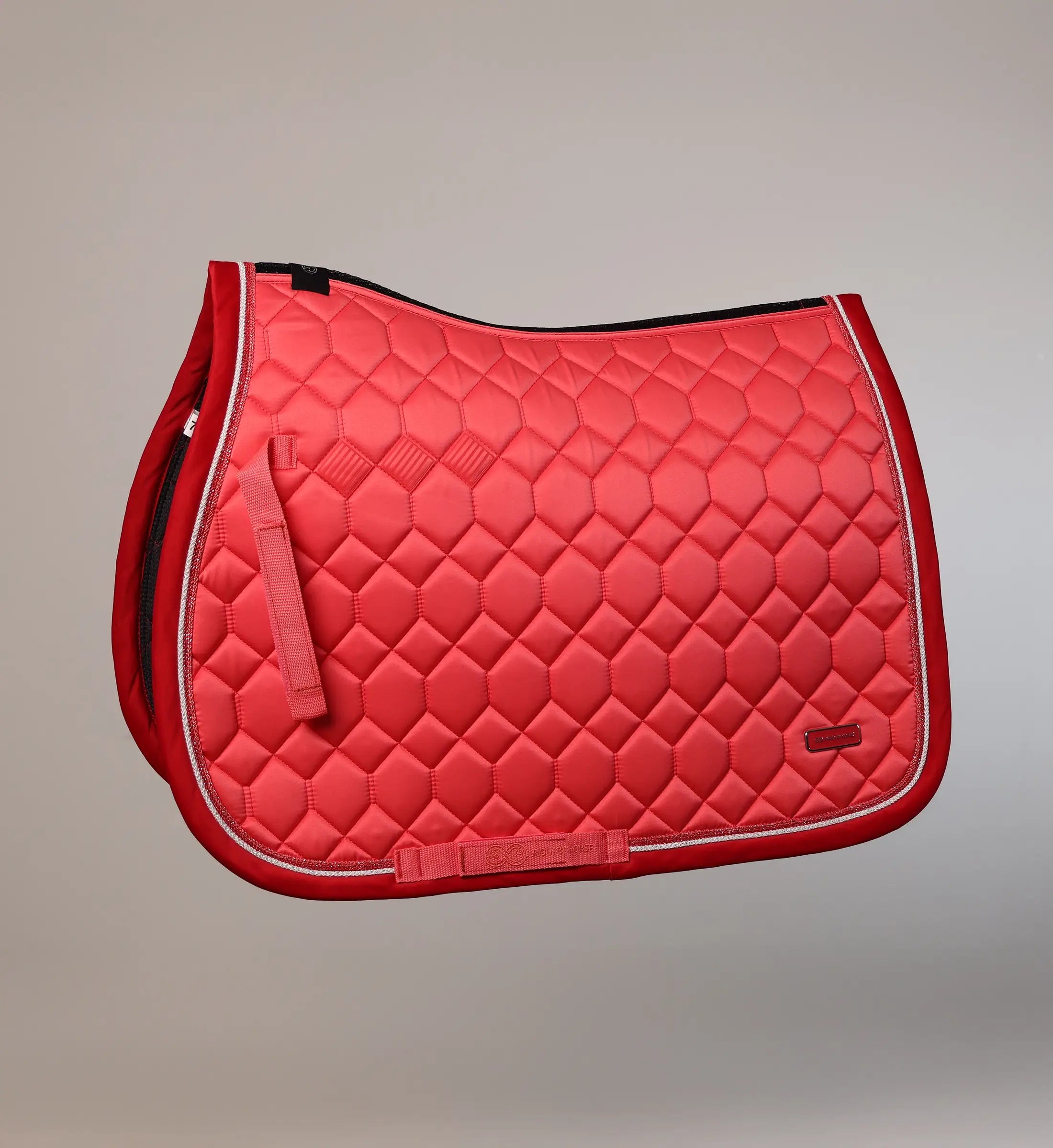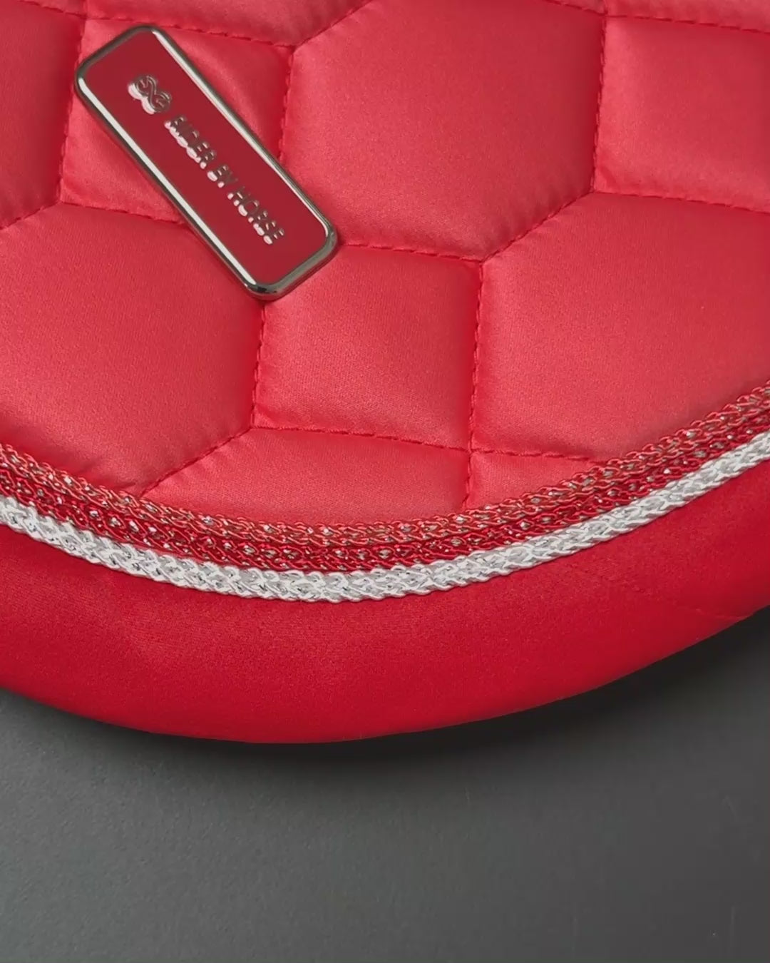 Elegant springunderlag i en livlig Calypso Coral satin med kontrasterende kantbånd i Lollipop red og fine detaljer i match farvede pipes med sølv. Udsmykket med det nye Rider by Horse-logo i metalfinish.