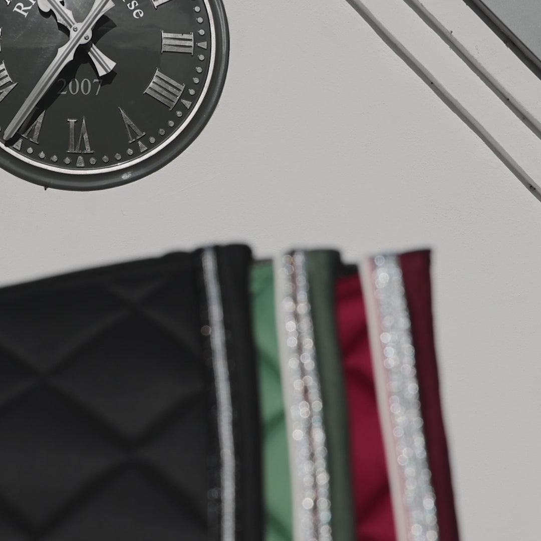 Underlaget er med sølvmetallic bånd med lille bronze pipe i midten og en offwhite lak pipe inderst. Inderside i blødt senstive stof, der er åndbar, skånsom og blid mod hestens ryg.