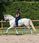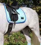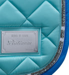 Platinum sadelunderlag i farven Tibetan Stone med Directoire Blue kantbånd. Udsmykningen er med et Platinum badge og krystalsten langs det hvide satinbånd.