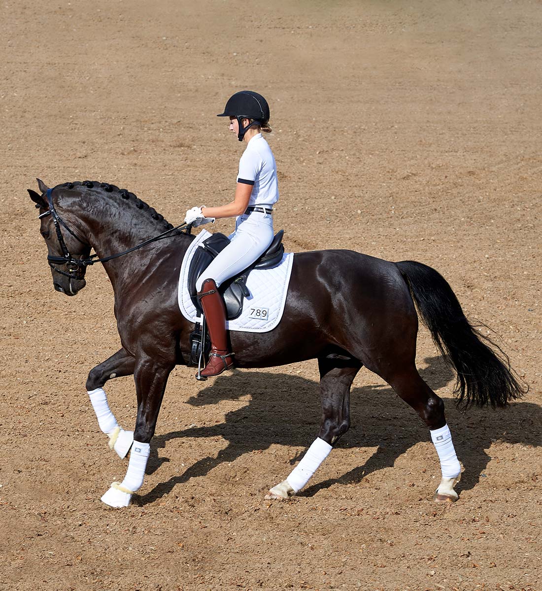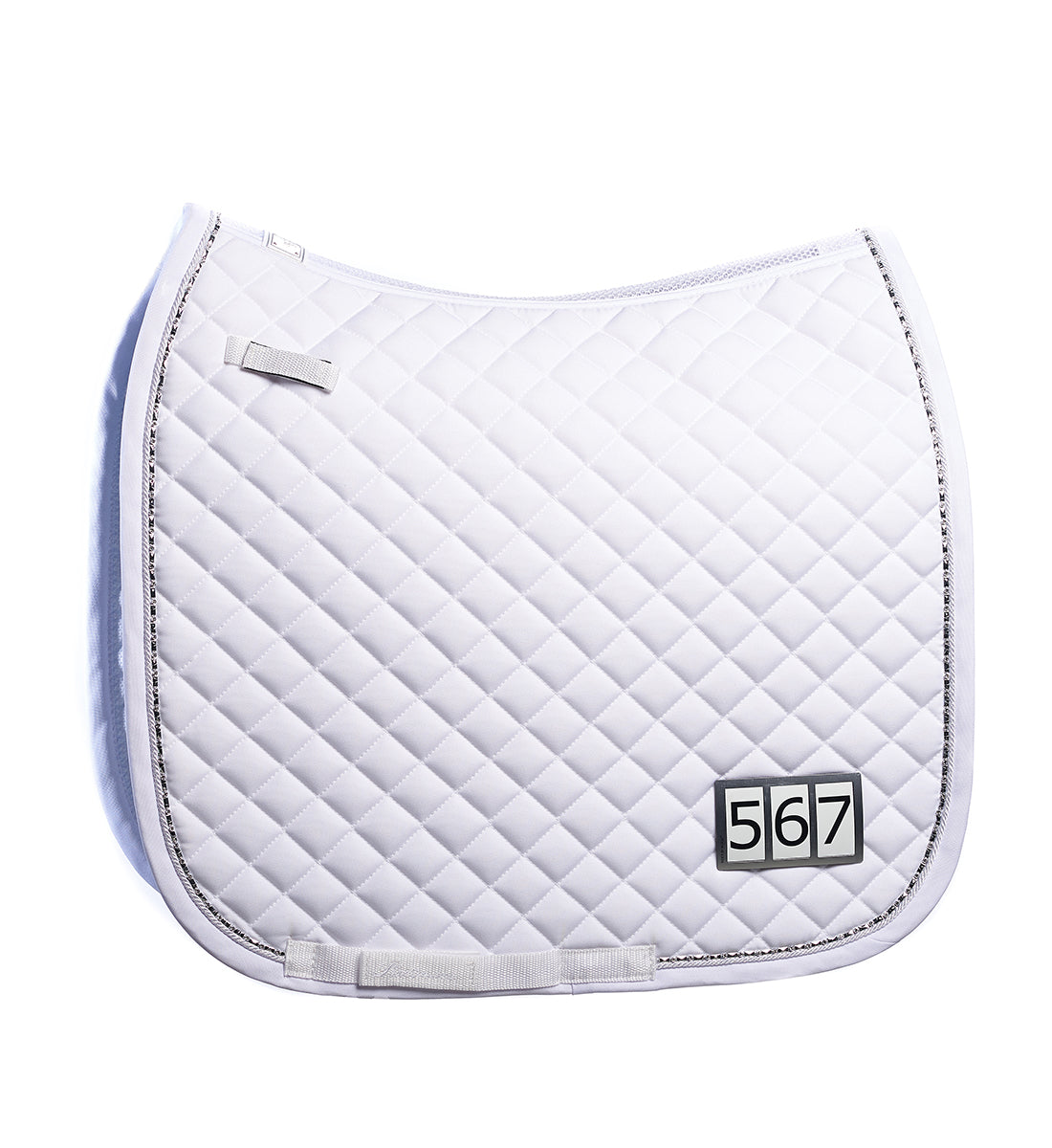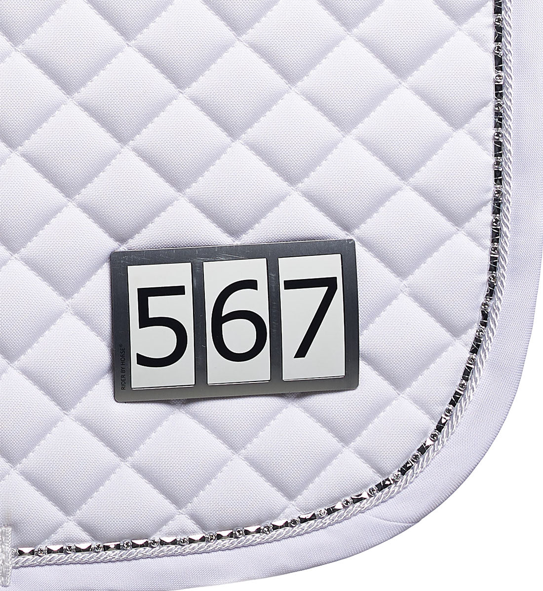 Klassisk dressur quiltet sadelunderlag med sølvkæde og sten til dressurkonkurrencer med magnetisk stævnenummer og tilhørende tal. Det indbyggede stævnenummer giver dig mulighed for et rigtigt stilrent dressurlook. Tallene der er magnetisk placeres let i den ønskede position og stævnenummeret fastgøres med velcro til underlaget. Der medfølger plastlomme for ekstra beskyttelse af nummeret.