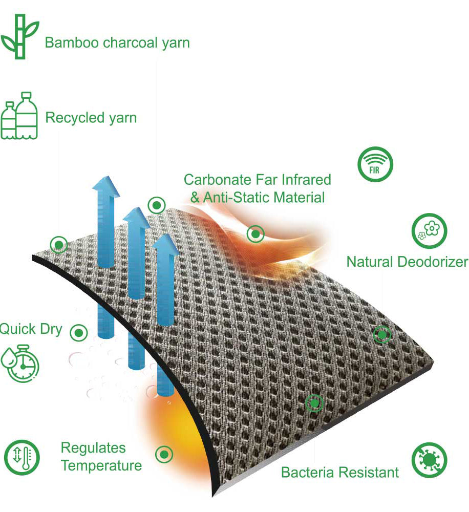 På Prestige Pro og Infinity Harmony sadelunderlagene er indersiden af disse Eco-Friendly naturlige bløde bambusfibre, der er bakterie resistent, naturlig lugtfjerner og temperaturregulerende. Samtidig gør Carbonate far infrarød at underlagene er behageligt antistatisk.