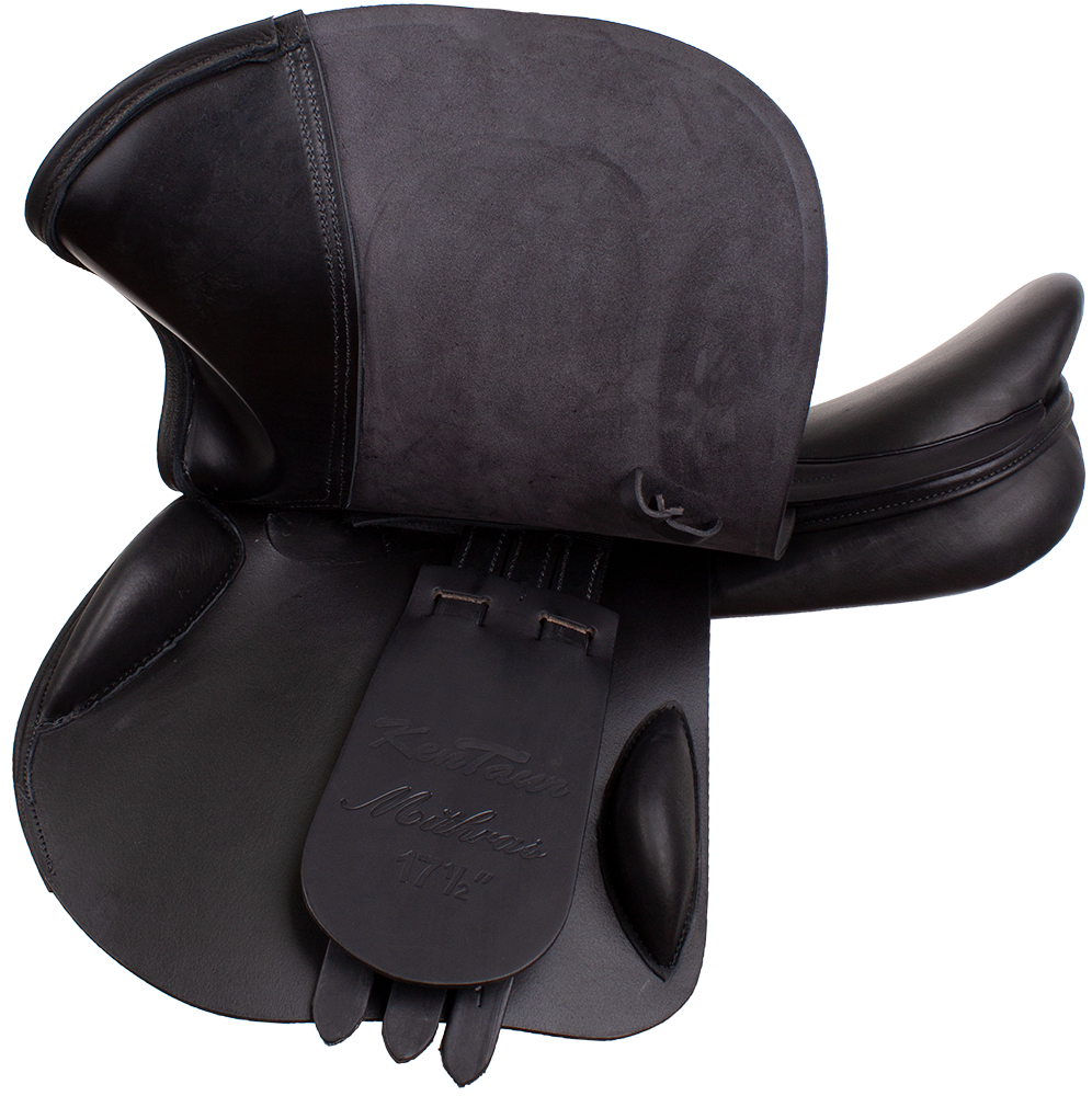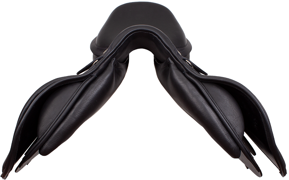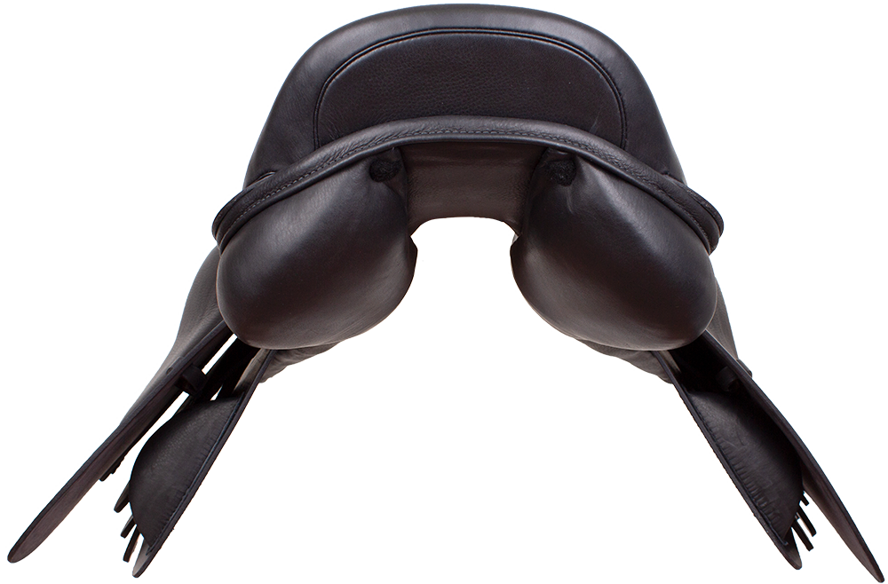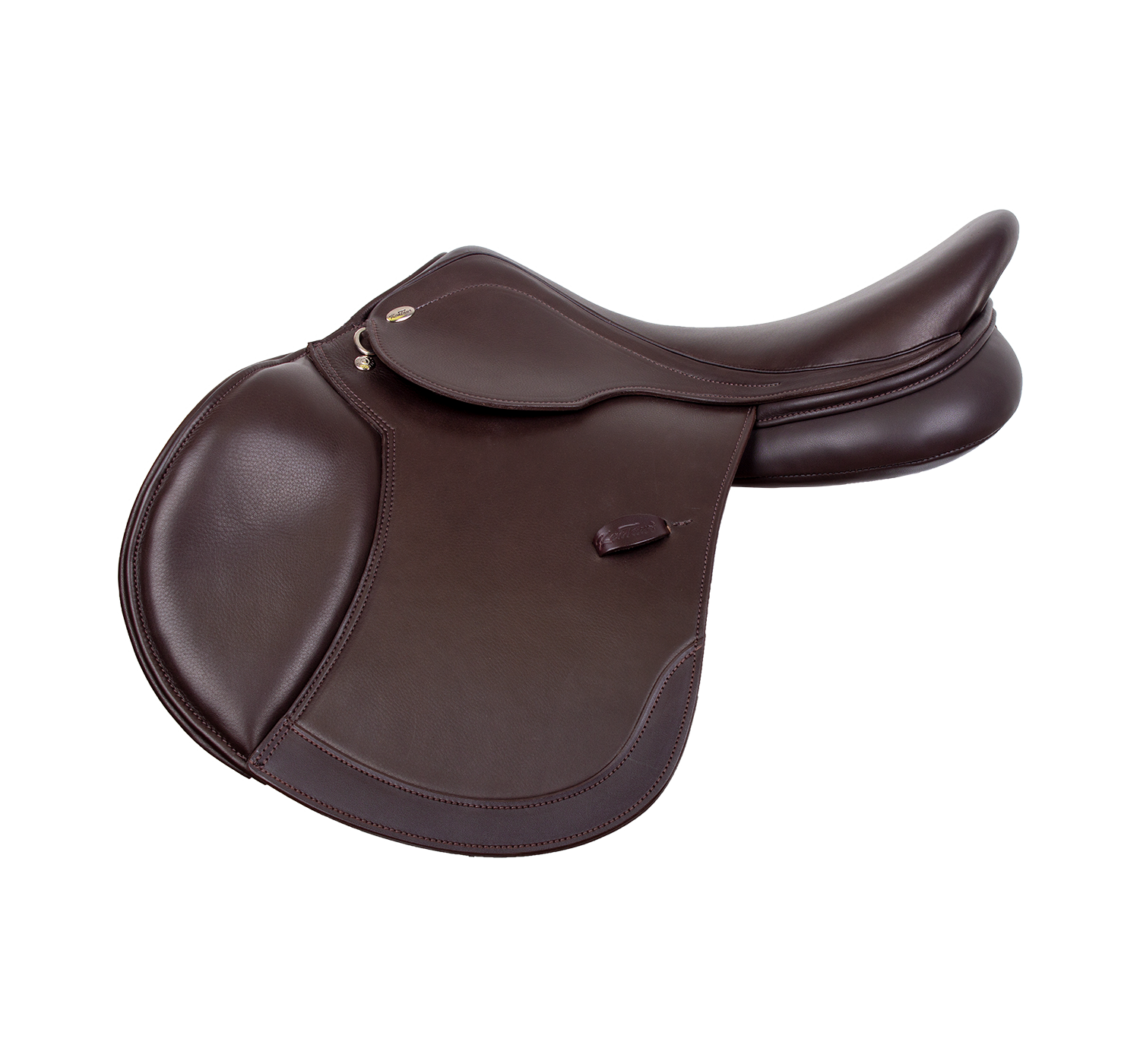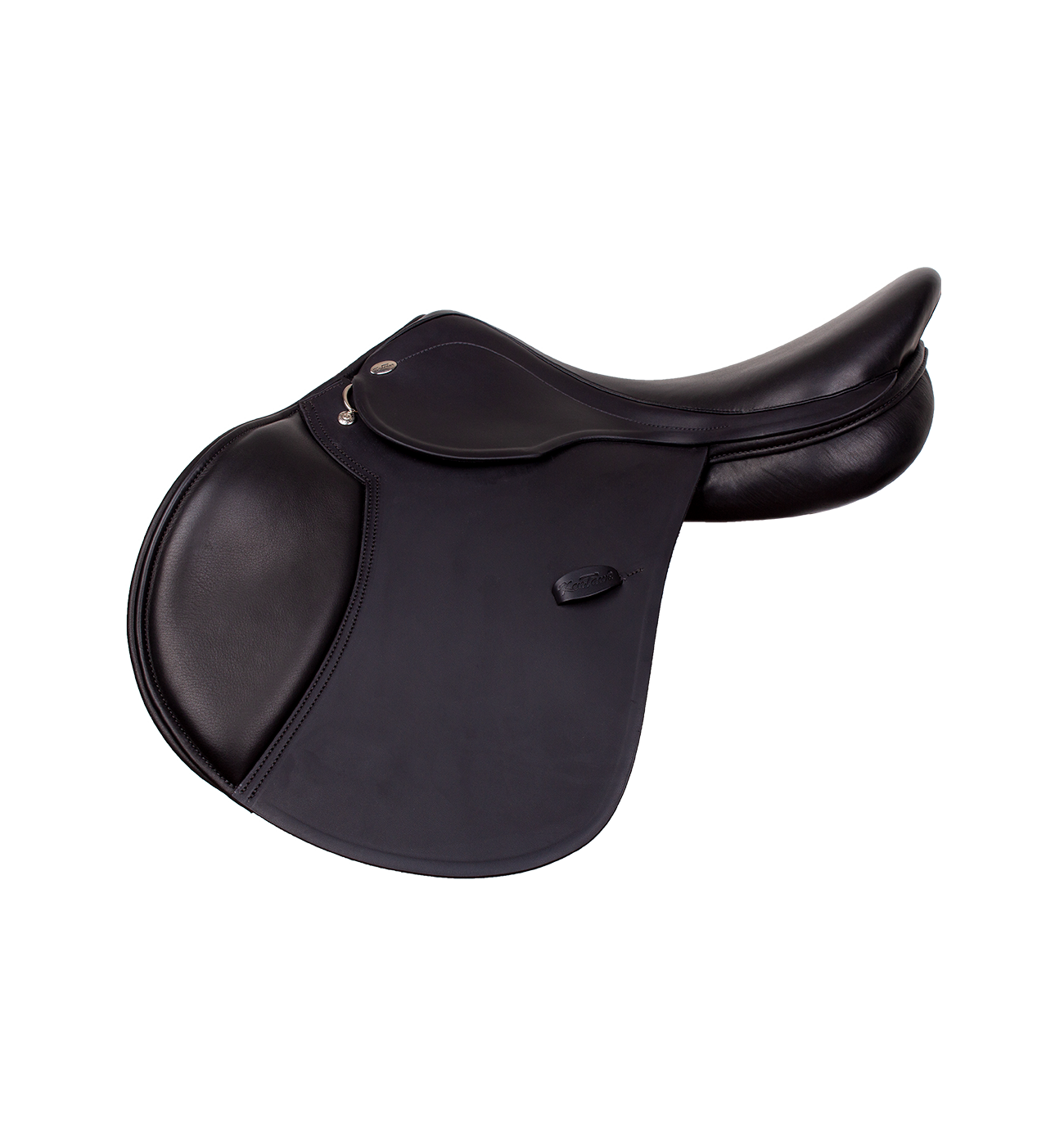 Helt ny model springsadel med medium dybt sæde. Den nye sadelbom er meget smal i den midterste del - giver rytteren et "close-contact" sæde, der der yderst komfortabelt og blødt. Knæpuder og sæde er som standard af antislip kalveskind.