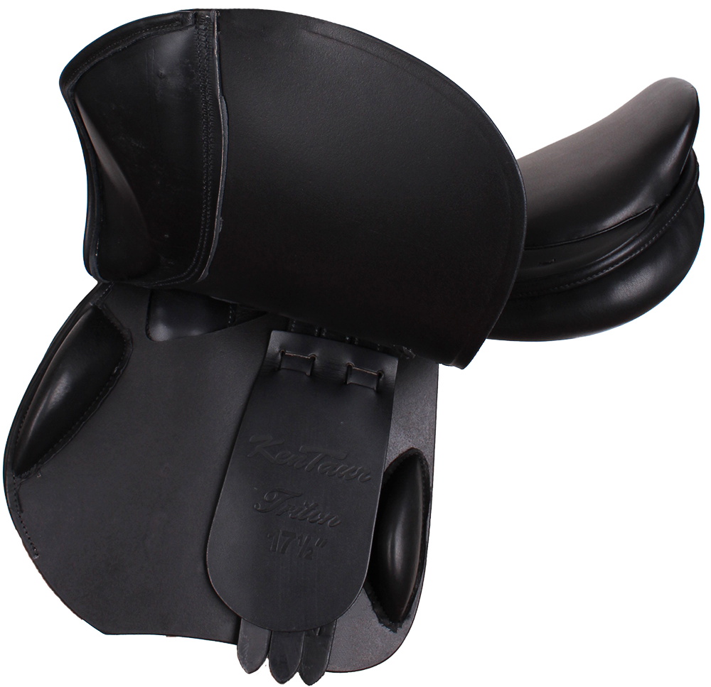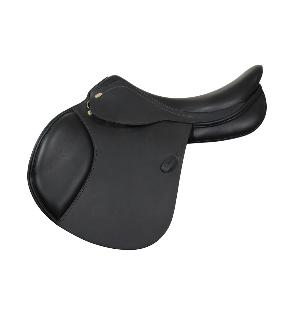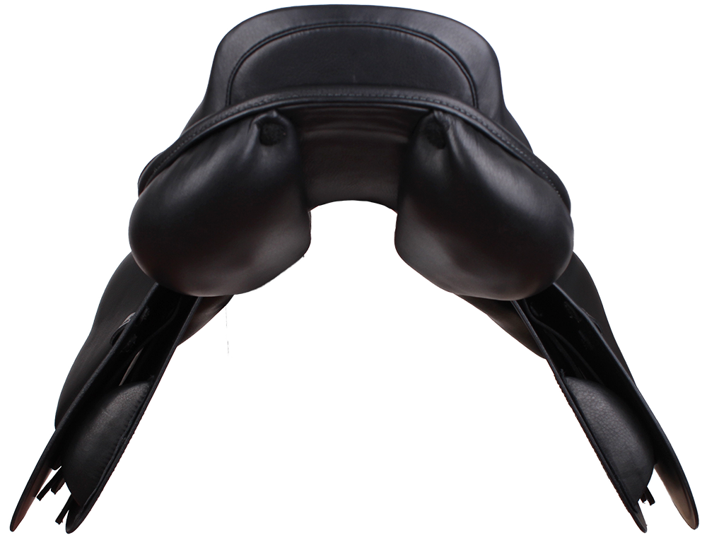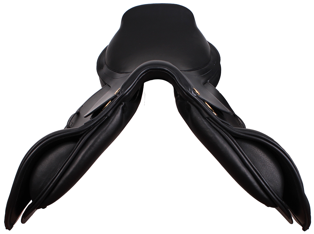 Spring sadel med flexibel bom og medium dybt sæde. Sadlen har formskårede sadelklapper og de meget brede sadel-paneler fordeler vægten fra rytteren optimalt. Sæde- og knæpuder er beklædt med anti-slip kalveskind.