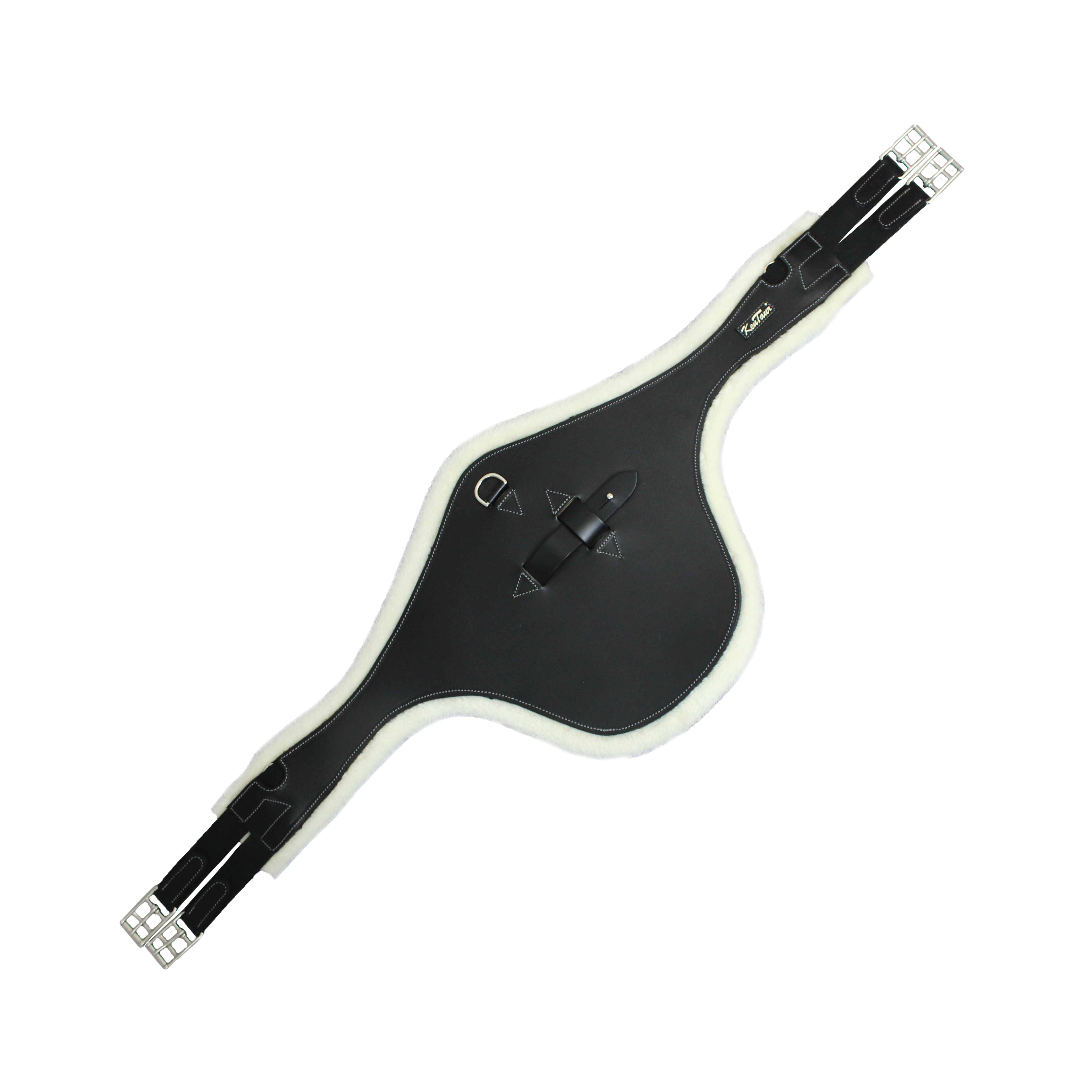 Maveplade gjord med elastik i begge sider, gjorden har lammeskindsforing, samt strop og praktisk ring til fastgørelse af hjælpetøjle.