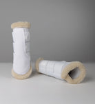 Nye letvægts Air1 Mesh dressurgamacher - BREATHE, vores mest åndbare og letteste gamacher nogensinde. Hvide stævnegamacher med blød faux lammeskindskant.