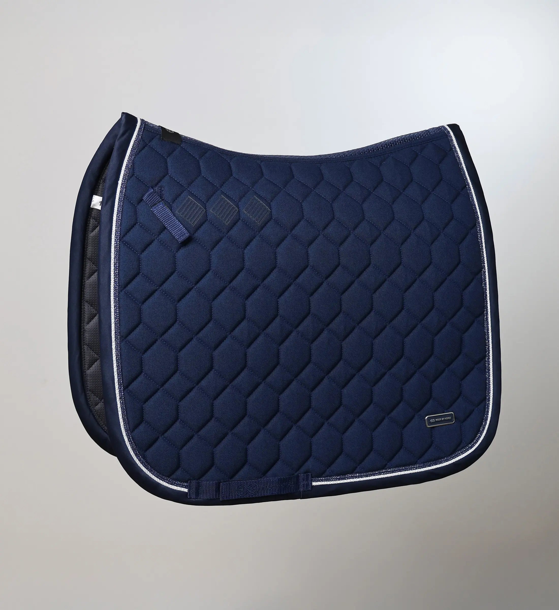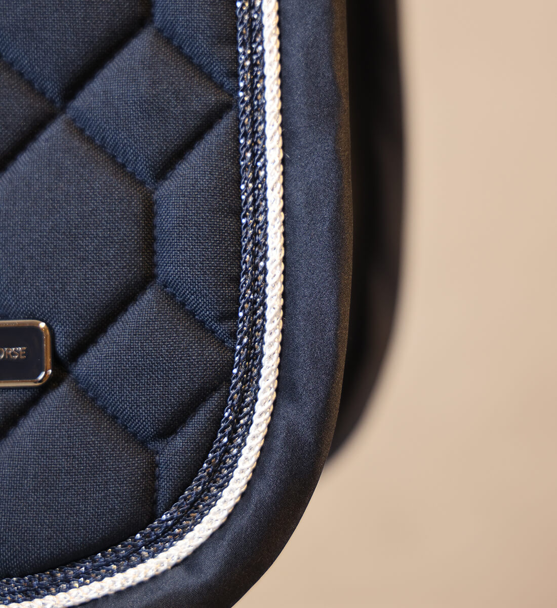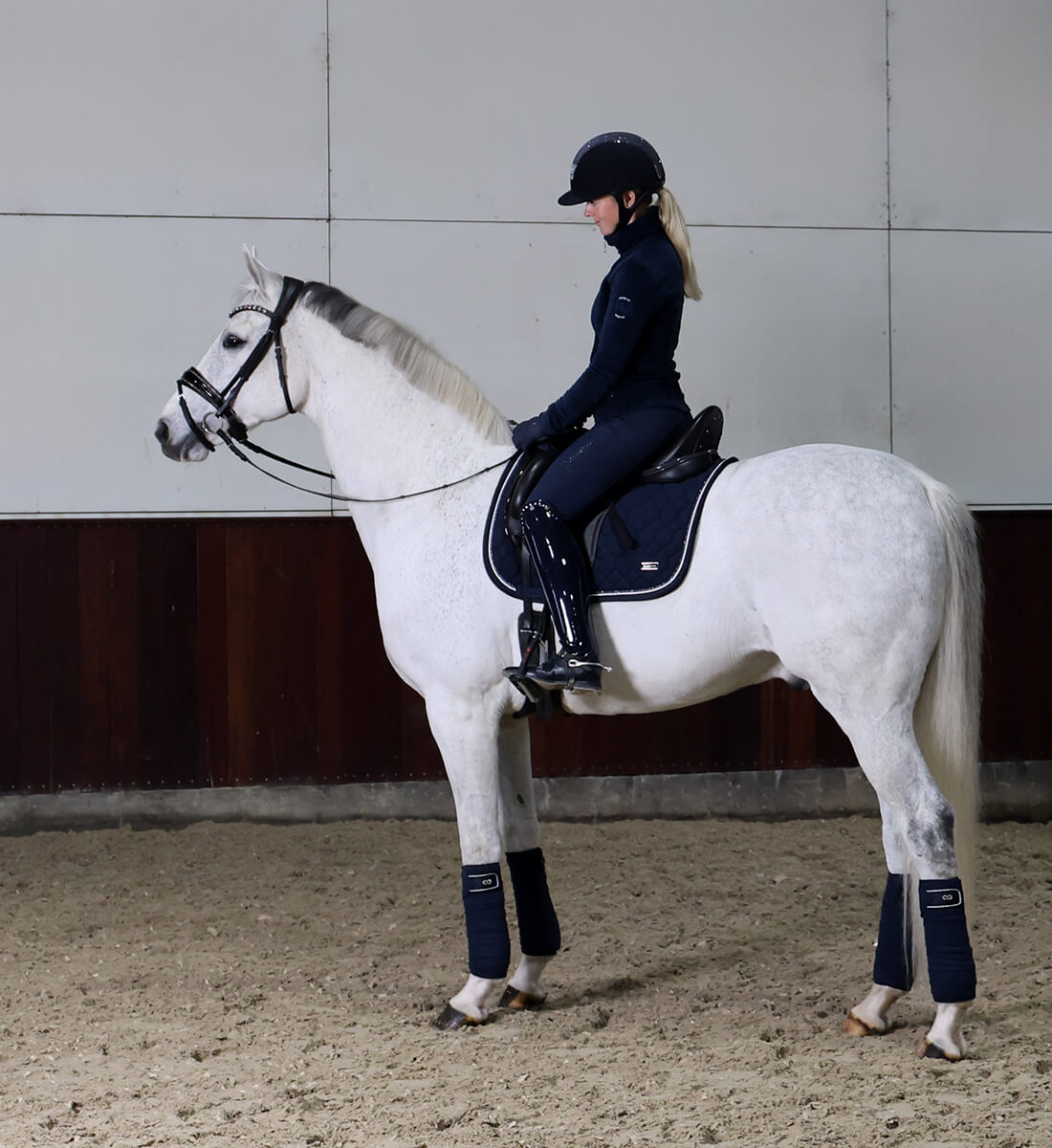 Underlag med luksuriøse, nyudviklede materialer og elegante pipings med en sølv-metallic kerne. Den innovative HIGH IQ COOL COMFORT™-teknologi transporterer fugt væk og fremmer hurtig fordampning, hvilket reducerer friktion og holder din hest kølig. Kombineret med antibakterielt BAMBUS-stof og det ikoniske AIR-1-system sikres exceptionel åndbarhed og temperaturregulering, så din hest forbliver mere tør og komfortabel – selv under de mest krævende ridt.