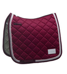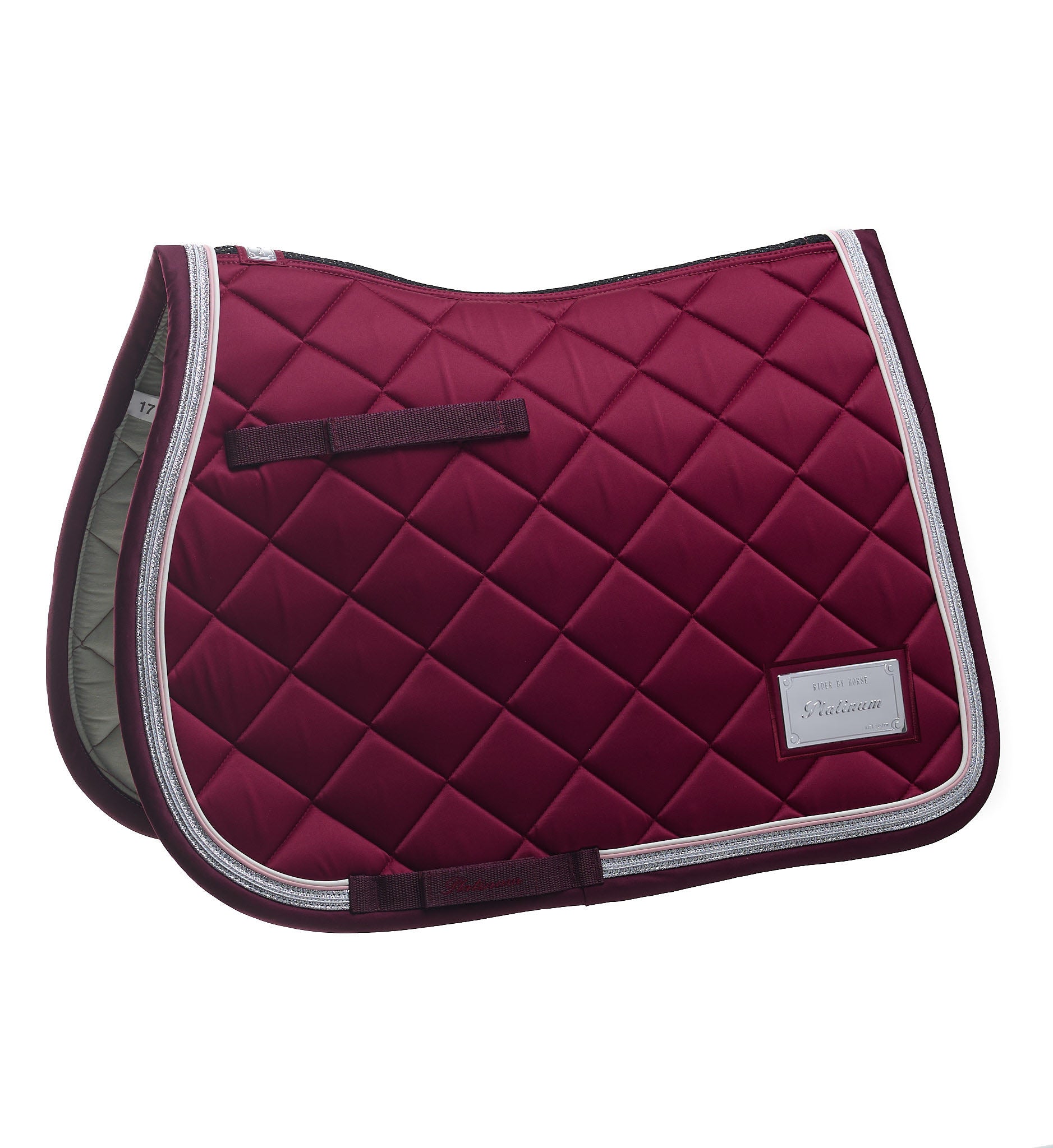 Platinum anatomisk formet sadelunderlag i glat, skinnende Beet Red satinstof med 3" Diamond quiltning og det ikoniske Platinum badge på venstre side.